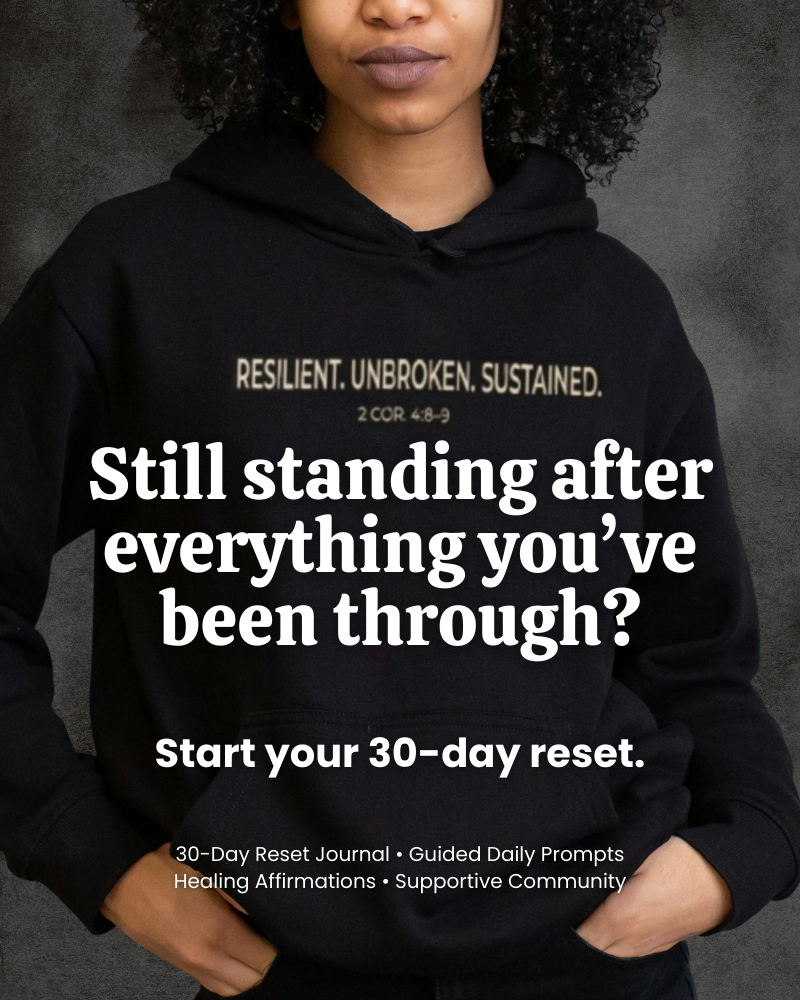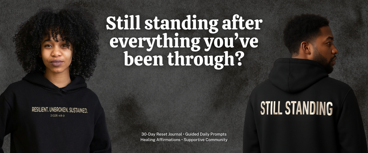 This reset includes the Still Standing 2 Corinthians 4:8–9 Hoodie, the Healing is Dope Journal, 30-Day Reset Prompts, and an Affirmation pack. You can also buy the Still Standing Hoodie and T-Shirt and the Healing is Dope Journal as separate products.