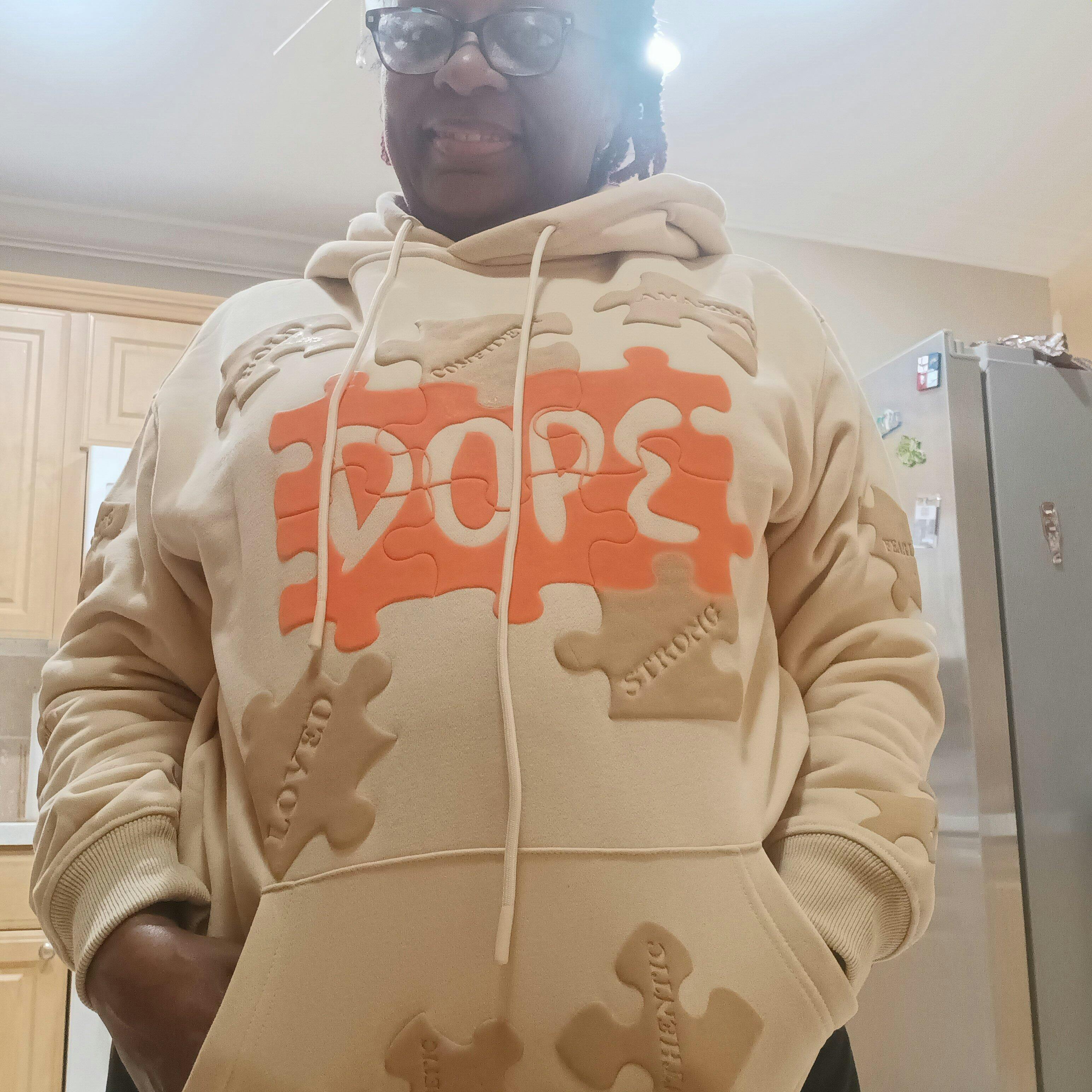 I just received my puzzle piece hoodie in the mail, I am so happy with it, I did not realize that it was going to be this soft and so fluffy, and the puzzle pieces set up off the material, very high quality material